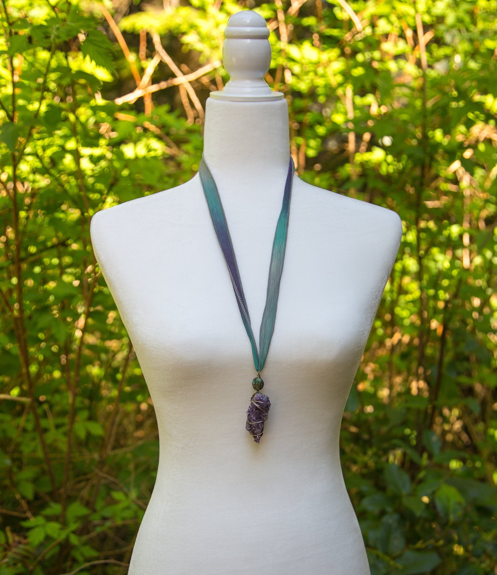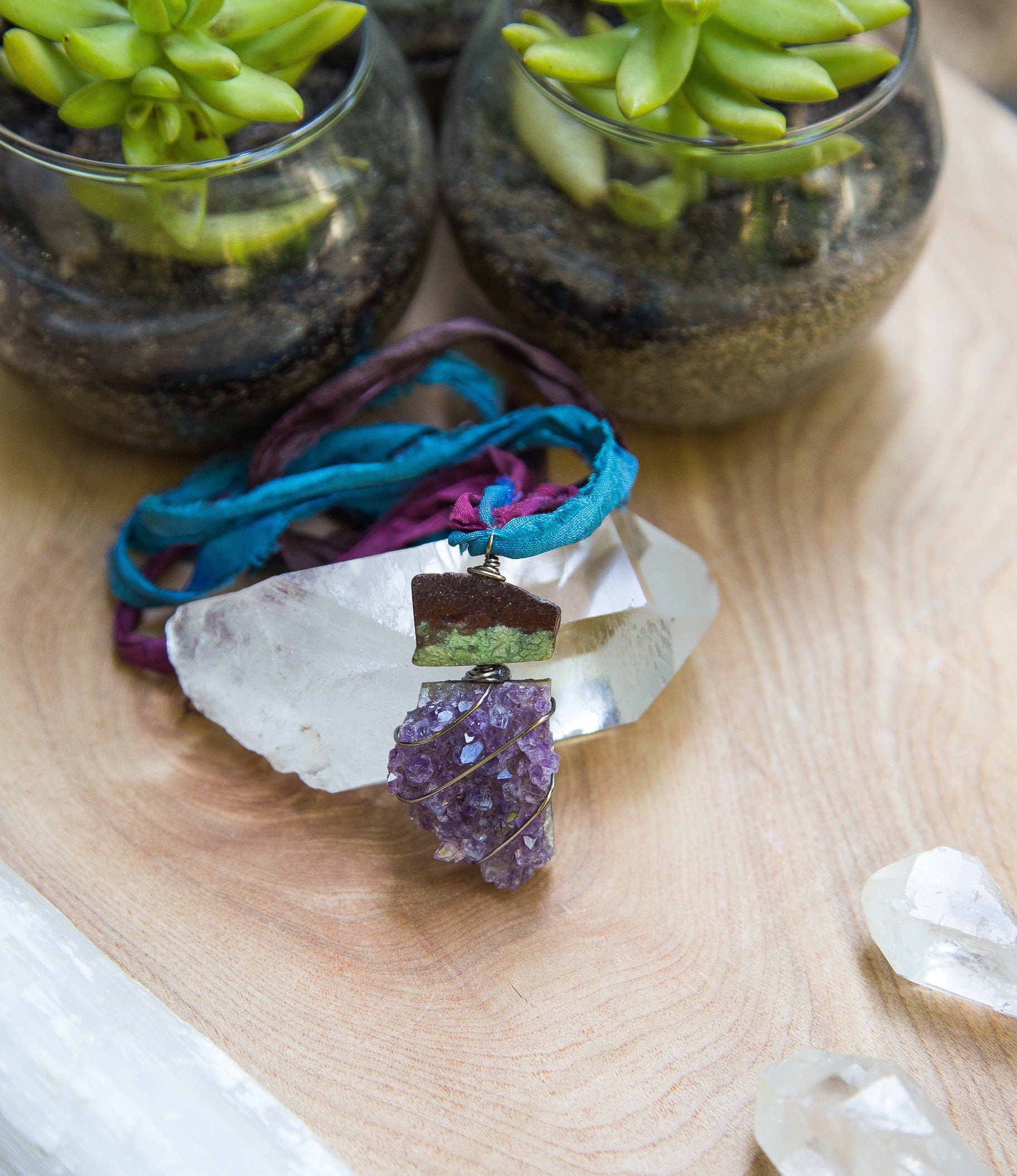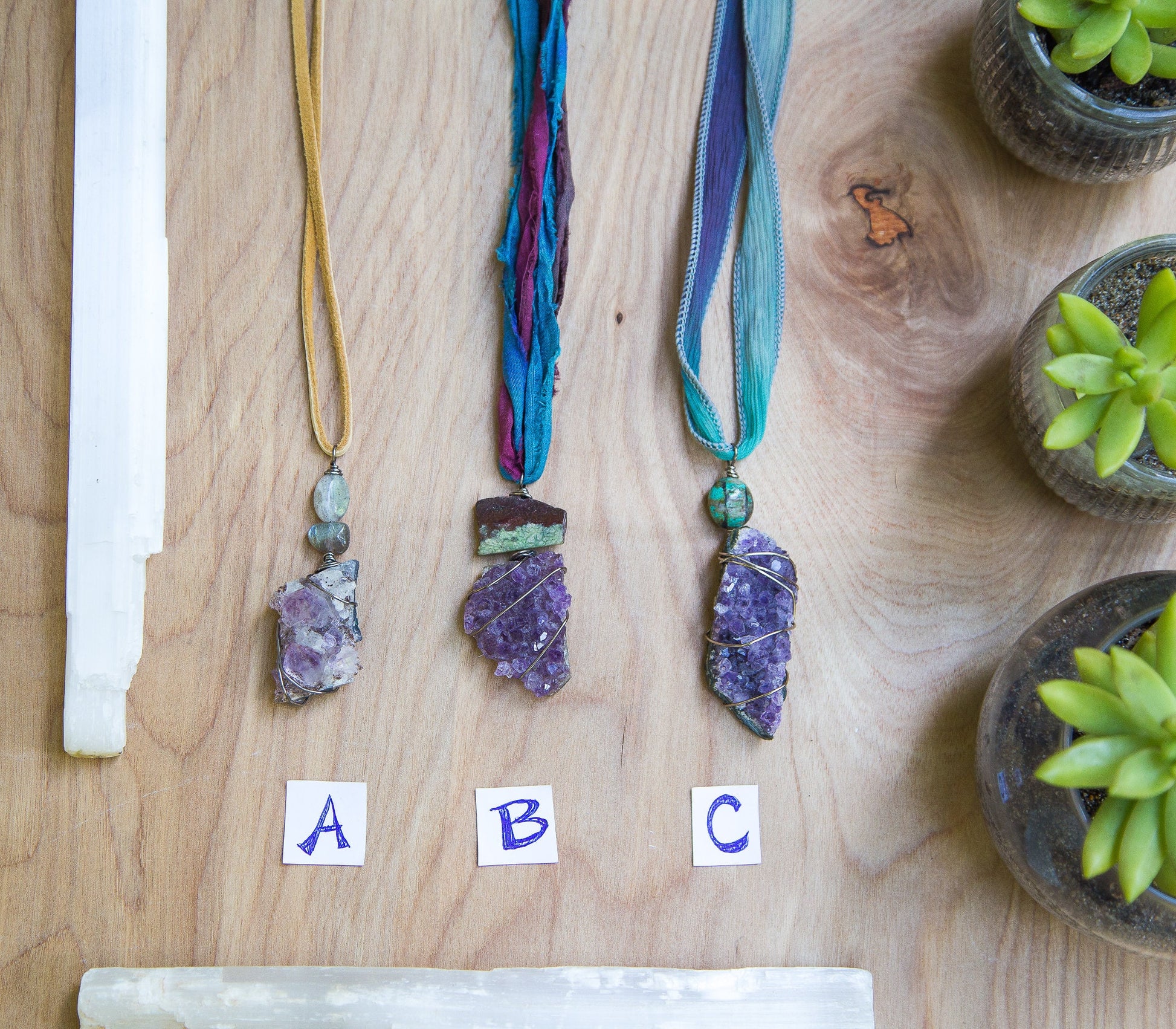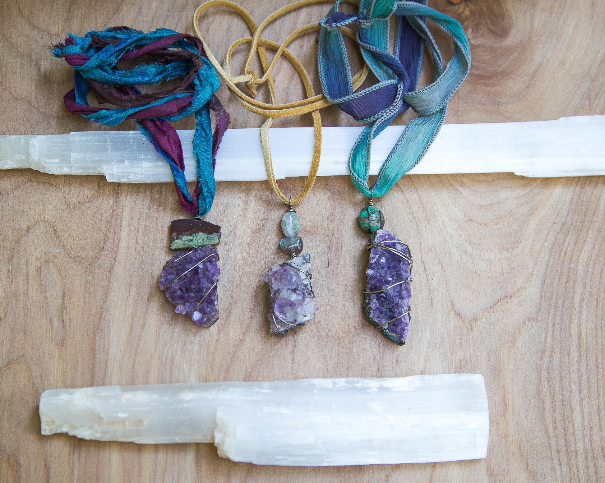 All of these pieces feature an Amethyst geode cluster , wire wrapped to another stone (or 2) and hanging mid to low chest. The supporting stones and cording on each piece are as follows;