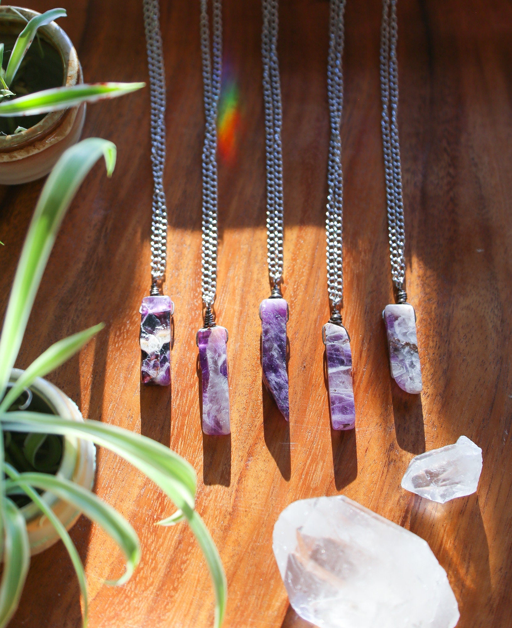 These piano key Amethyst necklaces are simply wire wrapped, and hung from stainless steel, hypo allergenic chain & finishings. This necklace can be hung at any of the pictured lengths, either 18, 21 or 24, 28 or 32 inches, of your choice. For a chocker style necklace, I can do 15 inches which is not pictured.