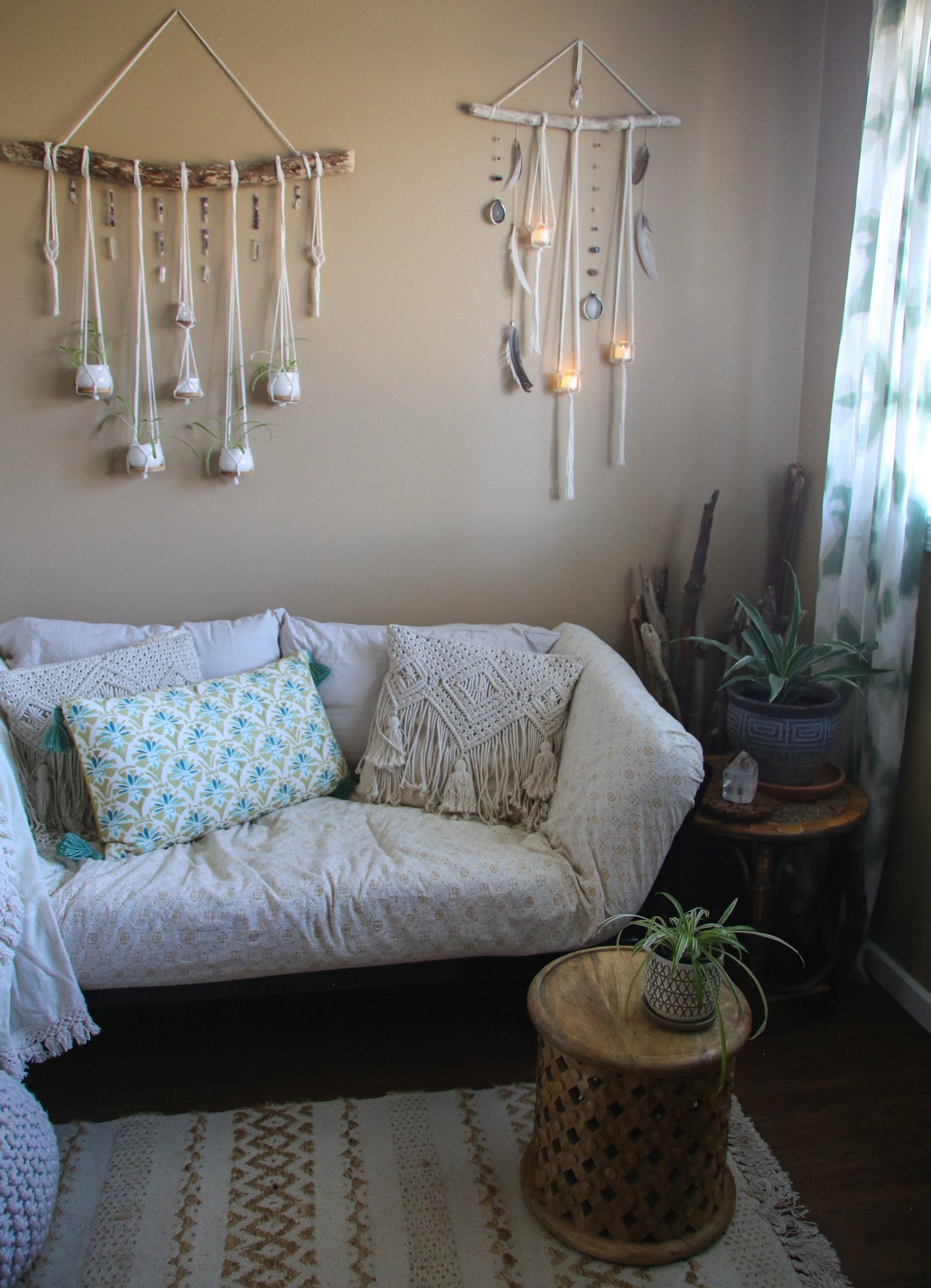 Unroll your décor gently before hanging it. Keep weight distribution in mind while placing any pots or glass in the holders.