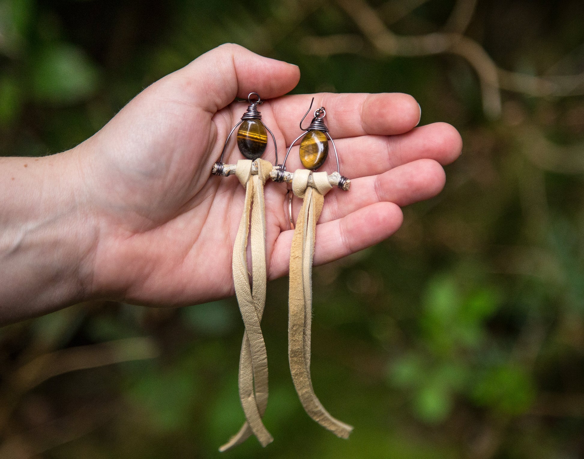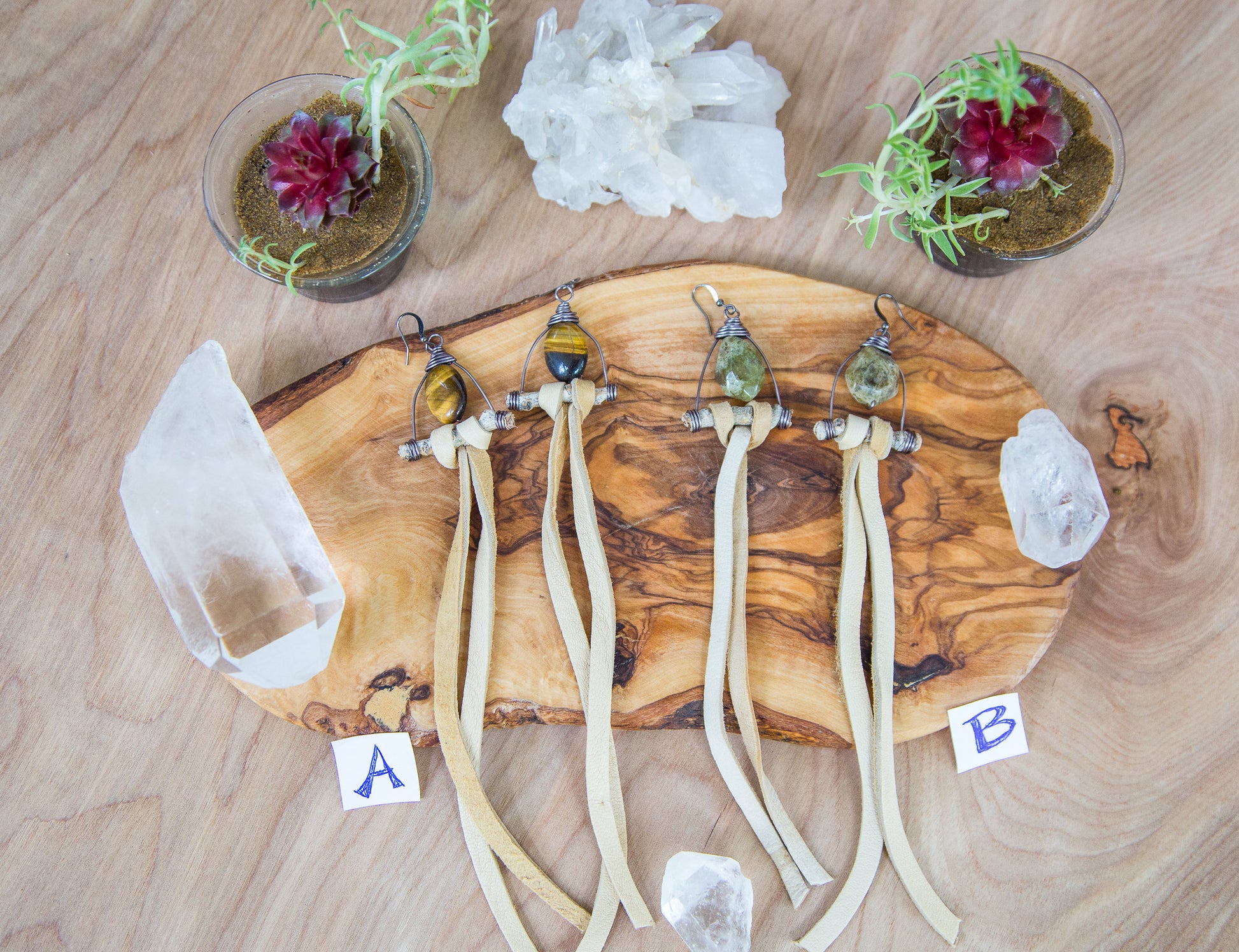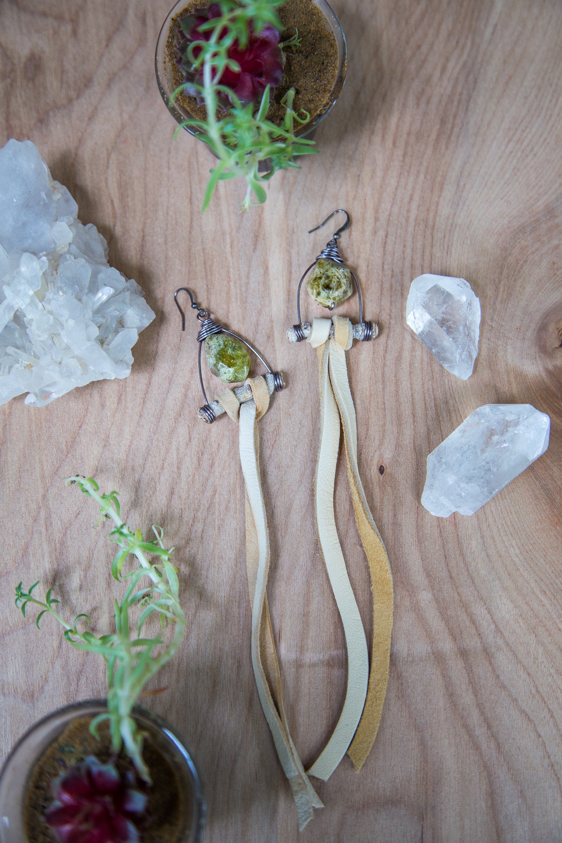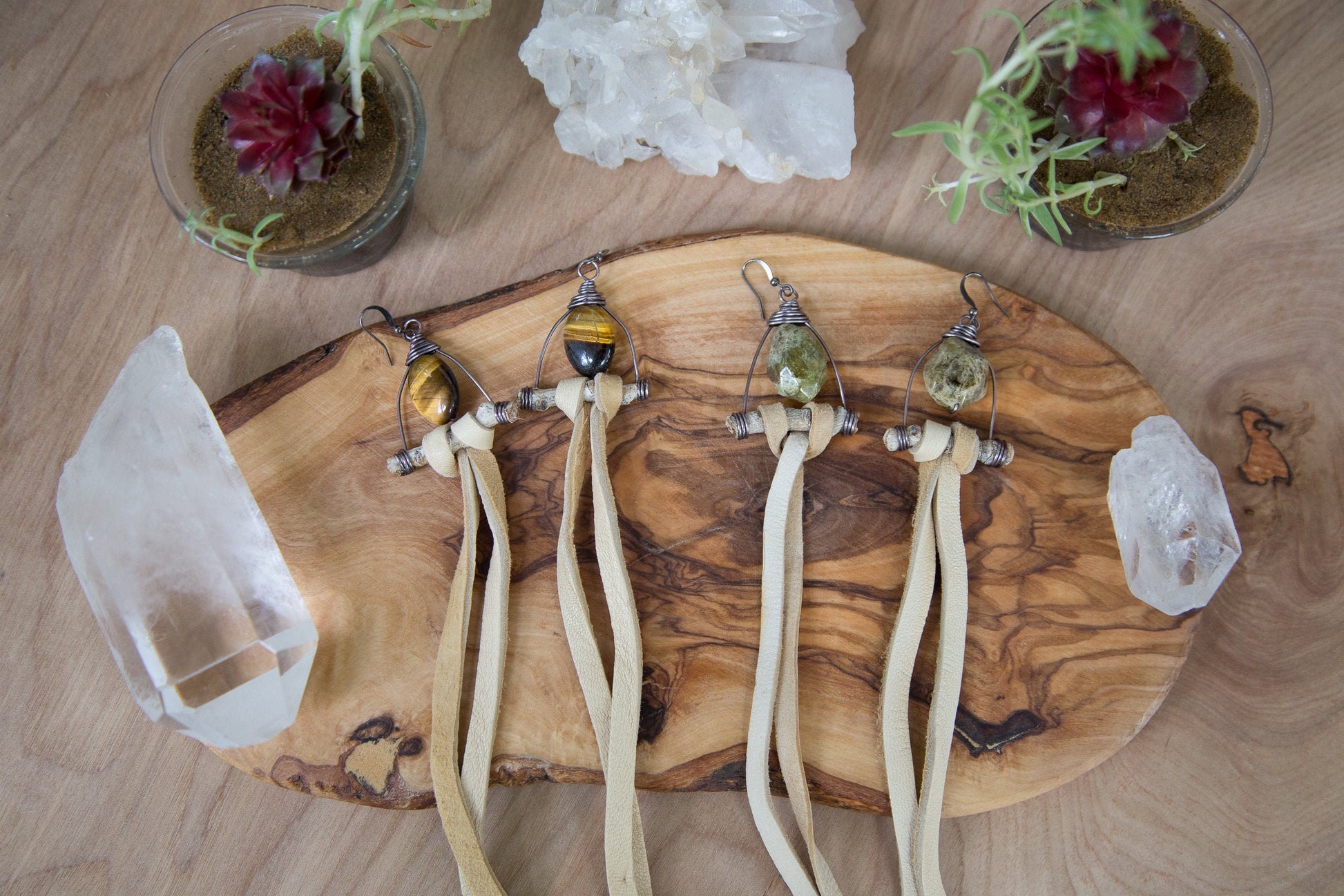This earring design is unique, featuring a tree branch as a base to hang gemstones & leather. The gemstones are wire wrapped and hung from the branches. (This design includes a small bit of clear epoxy on the back to insure security) Both pair has beige leather. This design was meant to carry the imperfect and raw feel of Mother Nature herself. These earrings are heavier than some, but are still comfortable to wear. The hang down slightly past the shoulder. They are made with hypo allergenic ear hooks.