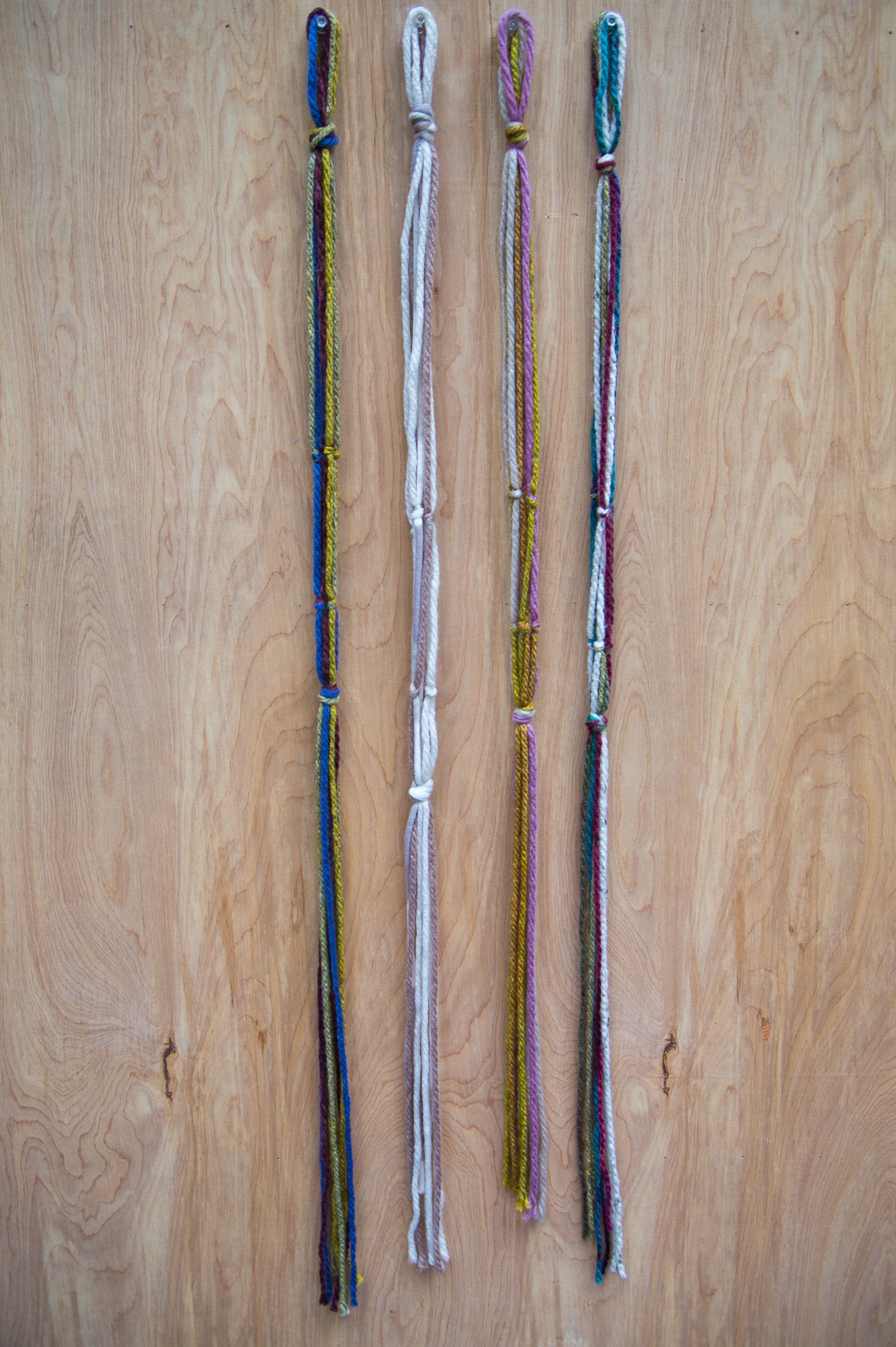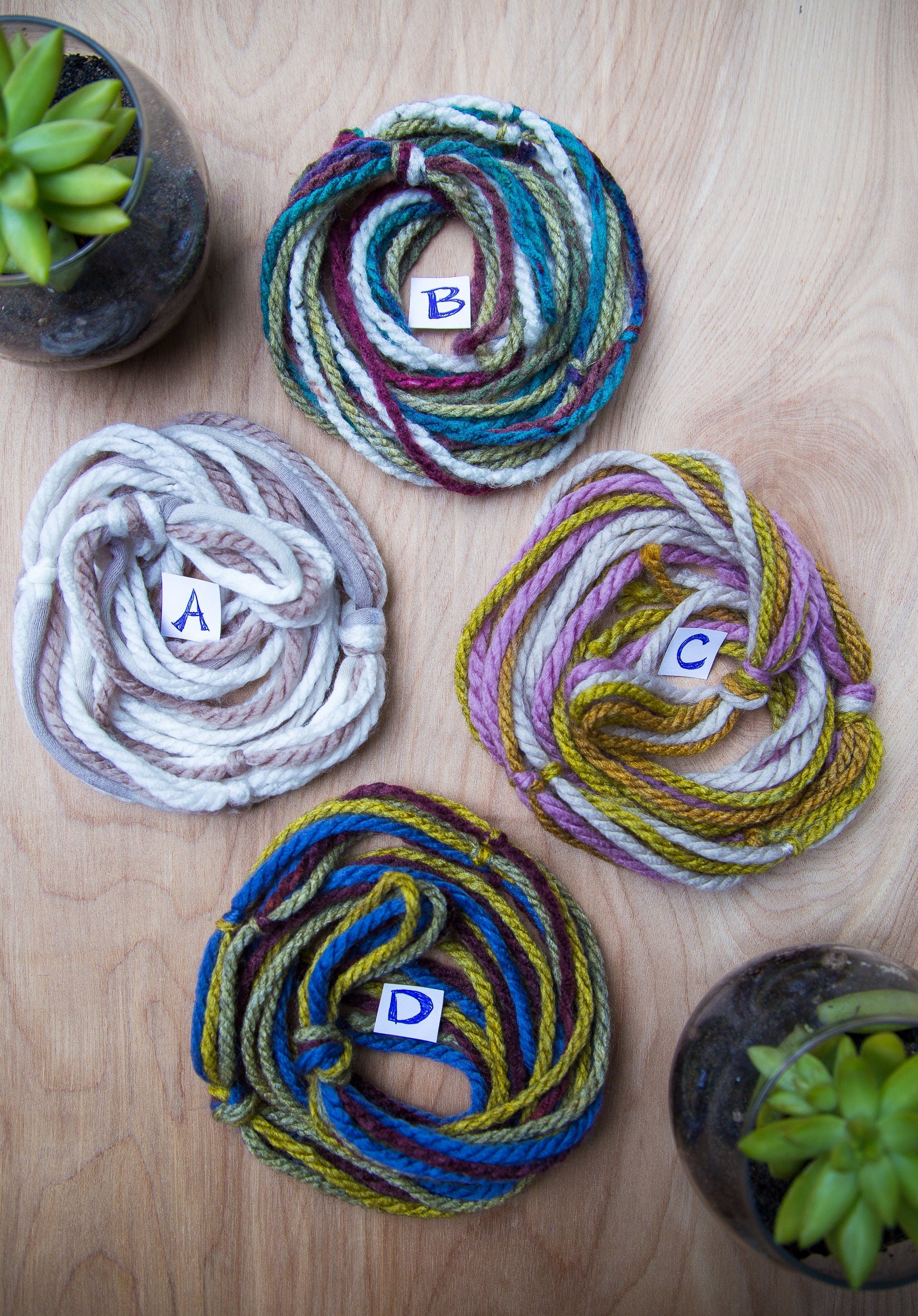These hand tied Plant Hangers are lightweight, easy and perfect for small plants! They are made out of yarn and intended for small scale pots or containers only.