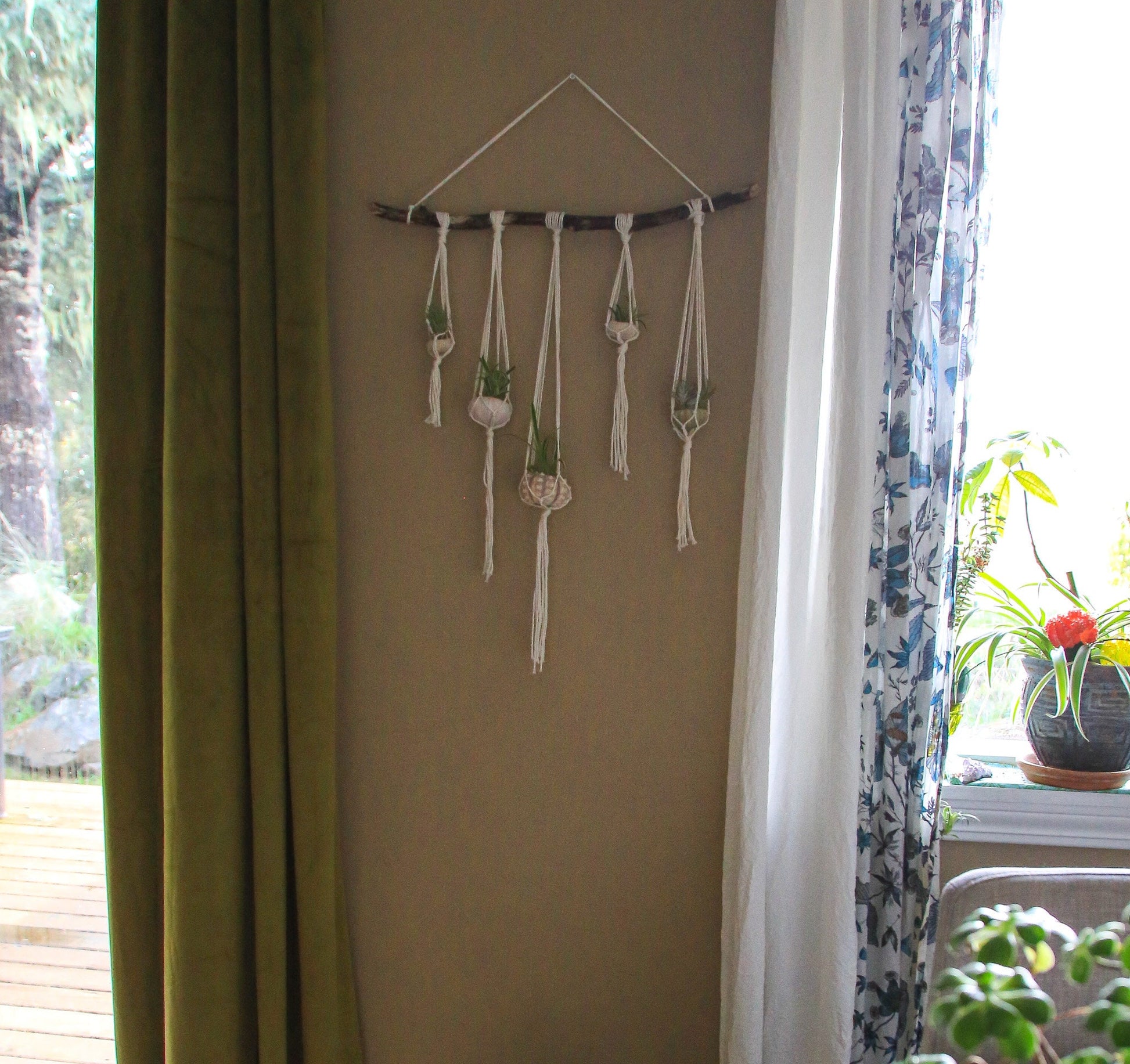 This Wall Hanging features 5 white plant hangers hung organically and comes with Sea Urchin Shells, perfect for housing Airplants. These shells are small to very small and are only to be used to house size appropriate Airplants, like pictured.