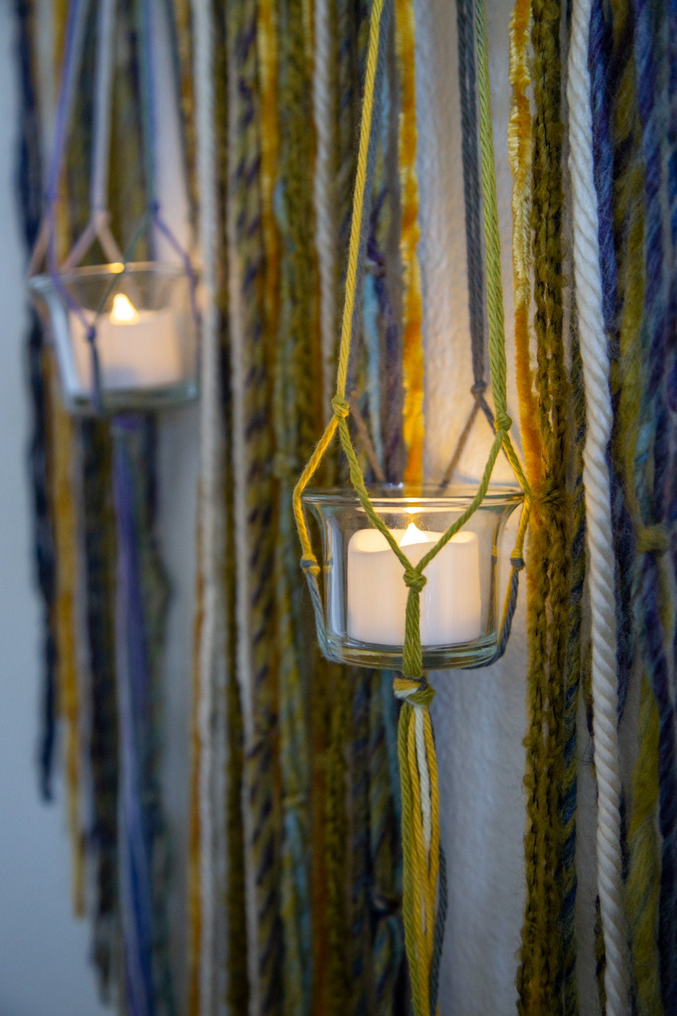 Unroll your décor gently before hanging it. Fill glassware with plants of choice or battery tea light candles before placing them in their designated spots. Keep weight distribution in mind while placing plant jars in the plant holders.