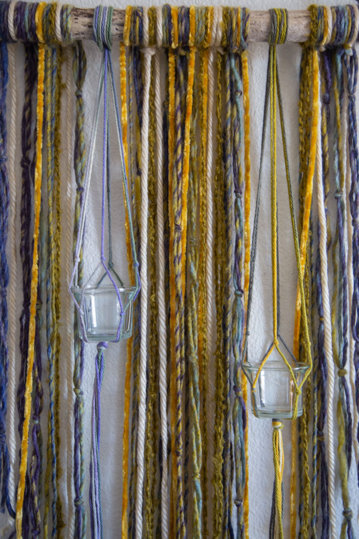The Plant hanger is made from multi different colored yarn and features 2 hangers. The color tones here are blue-purple, yellow, green and beige.